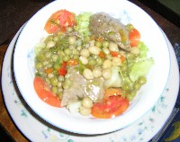 se abren tres latas de: guisantes, lentejas y garbanzos. Se unen a una