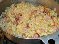 La pasta es uno de los platos que tiene mayor riqueza en cuanto a su preparación. Se hace un picadillo de cebolla, pimentón, cebollín y ajo, además de salchicha, jamón, tocineta y se deja sofreír bien. Cuando todo esté marchito se le agrega vino, dejándolo reducir y se toma suficiente creadme leche y se remueve todo. Mientras el agua esté hirviendo se le agregan los caracolitos y al estar al dente se llevan al sofrito y de inmediato se sirven con abundante queso parmesano. |