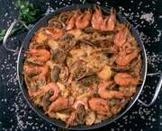 La noche anterior corte el pollo y el cochino en pedazos, más o menos pequeños. Licue cebolla, aceite, ajo, sal y en una bolsa meta los trozos y déjelos dormir. Los calamares los corta en anillos y déjelos dormir en un poquito vino, agua, limón y sal. Limpie los camarones y los langostinos (con cabeza y concha). Ponga la paellera al fuego de leña y deje que se caliente muy bien. Agregue un poquito de aceite y luego una lata de mantequilla. Allí sofría el pollo y el cochino hasta que estén dorados. Sáquelos y coloque los calamares y el arroz y sofría bien. Regrese el pollo y el cochino. Échele sal, pimienta, sazonador para paellas que contengan cúrcuma o pistilos para pintar. Agregue el contenido de la bolsa y donde estuvo dormido los calamares y el agua exacta para el arroz. Remueva. Tape con papel de aluminio y déjela. Cuando ya esté secando agregue los camarones, los langostinos, adorne con pimentones en rodajas y arbejitas tiernas. |