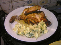 Pollo al horno con baño de salsa de mostaza y ensalada de papas cremosas |