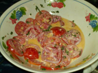 Seguimos con las ensaladas, y hoy tenemos una muy buena y fácil. Se cortan los tomates en rodajas y se dejan en agua con sal. Aparte se hace una viagreta de jugo de limón, natilla, mostaza, pimienta, sal y perejil. Se escurren el tomate y se mezcla. Se debe hacer al mometo de comerla. |