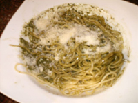La pasta es larga y s ehace como de costumbre (al dente) En el vaso de la licuadora se coloca albahaca (hojas) bastante, sal, pimienta, maní y un poquito de agua. Se lleva a licuar y luego poco a poco en forma de chirrito se le va agregando el aceite de oliva. Se busca un sartén hondo y allís e coloca la salsa y al tomar calor se le colocan los espaguetis y se revuelve muy bien con queso parmesano en abundancia.