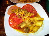 Se limpian bien los calamares y se ponen a sofreir en aceite d eoliva y mantequilla, se le agrega ajo, cebolla bien menuda y se termina con vino blanco. Se reservan. Aparte en una fuente se coloca el tomate en rodajas se le agrega sal, vinagre de vino, pimienta. Se mezcla muy bien y por último s ele decora con arbejas tiernas y maíz. Se acompña con casabe o pan campesino en rodajas. |
