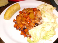 Se usa pechugas, sal pimienta, y se dejan marinando en vino tinto, cebolla en zanahoria en cubos. Unas seis horas. Se escurre la pechuga y se sella en aceite bien caliente. Luego se lleva a un caldero con el jugo de la marinada y se empieza a sudar lentamente. Se acompña con una ensalada verde común y platano verde (andino? |