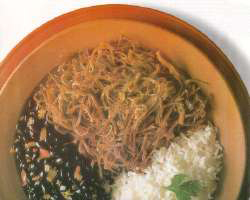 La pechuga de pavo es especial para esto. Se lava y se coloca en un recipiente con cebollín, ajo, cebolla y se deja cocinar. Luego se desmecha y se lleva a caldero donde junto a pimentón rojo, cebollín, cebolla y ajo se deja, a fuego lento que se vaya secando. Sal, pimienta. El arroz como de costumbre y lo mismo las caraotas. |