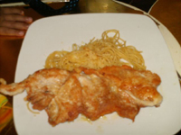 Vamos a utilizar pechuga de pollo que se abre muy bien, en forma de abanico y se deja macerando en agua, sal y limón. Luego se escurre y se lleva la plancha para ir dorándola poco a poco. Aquí se acompaña con pasta larga en salsa blanca.