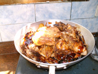 El pollo se pone a macerar con un licuado de cebolla, salsa inglesa, soya, pimienta, sal, azúcar y jugo de naranja. Al otro día se escurre y se coloca a dorar. Luego se le agrega la maceración y se deja cocinar a fuego medio.