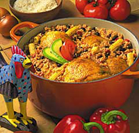 Vamos a utilizar pollo asado, esos pollos que venden en las polleras. Se mandan a picar en cuartos. Aparte se pica en juliana pimentón rojo y verde. El apio españa en pedacitos y el ajo triturado. En un caldero colocamos aceite de maíz (poco) y sofreímos el pimentón y el apio españa, luego el ajo y de inmediato el arroz (1 taza de arroz dos de agua) Luego echamos el pollo con el jugo que trae en su empaque. Revolvemos , colocamos sal, pimienta y si lo quiere amarillento agregamos cúrcuma. Dejamos caer arbejas tiernas y adornamos con algunos pimentones. Dejamos hervir, bajamos la llama y tapamos hasta que quede completamente suelto.