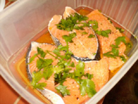 Este pescado por ser de aguas muy frías necesita mucha suavidad en su trato. Se limpia con cuidado, y se coloca en una fuente que vaya al horno con jugo de limón, aceite de oliva, un poquito de mostaza, sal, pimienta y cilantro. A fuego lento en el horno cinco minuetos tapado y otros cinco destapado. |