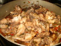 Se lava muiy bien y s ele quite todo el cuero. Se deja dormir en cebolla rayada, comino, salsa de soya, canela en rama, sal, pimienta. Luego se escurre. En el caldero, grande, se coloca aceite de maíz (muy poco) para cuando esté caliente se le agrega en juliana cebolla, pimentón, apio españa, ajo,. Cuando esté medio sofrito se agrega el pollo con todo el condim,ento donde estuvo marinandose. Se le grega un poquito más de agua y sal y se deja sudar a fuego lento. Se sirve con arroz, con pasta o simplemente con casabe. |