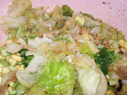 En un recipiente puesto en la cocina a fuego medio se coloca salsa de soya, azúcar, vinagre de vino, sal, pimienta y se deja hervir. Aparte se limpian las lechugas y se llevan a un sartén con aceite de oliva y mantequilla junto a unos calabacines cortados en cubitos. Luego en un recipiente de vidrio se une todo. Acompaña a carnes y pescados |