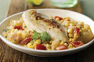 Utilizaremos pechuga esta vez entera. Se hace un aderezo de miel, salsa de soya, ajo, sal, pimienta y allí se sumergen las pechugas (1 hora) Luego cocinas la pechuga en ese aderezo. Luego, en un sartén sofríe cebolla y el pimentón para luego agregar caldo (con los huesos del pollo) y el maíz