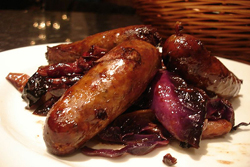 Caliente el horno y acomode un envase para horno con un poquito de aceite vegetal. Aparte pique cebollas, ajo y vas haciendo una cama en el envase e intercambiando con salchichas enteras. A eso le agregas un poco de caldo, pimienta, sal. Todo al horno. Se comen de inmediato y se acompañan con puré de papas. |