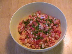 Lavar muy bien los tomates y se pican en trocitos. Colocados en un recipiente se mezcla con aceite de oliva, jugo de limón, yogurt natural, un punto de mostaza, cebolla pasada por vinagre y albahaca bien fina.