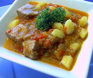 Se fríe un poquito el atún en trozos con sal en aceite de oliva, volteándolo cuando empiece a cambiar de color y manteniendo el interior casi crudo y separar. En ese aceite, se hace un sofrito con la cebolla troceada, el pimiento rojo, los ajos (partidos en trozos grandes) y por último, el tomate natural triturado. Se añaden las papas y se rehogan un poco, añadiéndoles sal. Se añaden la picante, el caldo de pescado y el colorante (onoto). Se deja cocer aprox. 30 minutos (según el tamaño de las papas. Se incorpora el atún y se deja cocer 5-10 minutos más. |