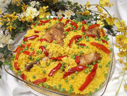 Se lava el pollo y se pica en trozos, se secan y se le coloca sal para luego sofreírlos. Con algunos huesos del pollo se hace un caldo. Aparte un caldero con margarina y un poquito de aceite y se coloca ajo, ají dulce, apio españa se deja dorar. Se agrega el pollo, cúrcuma y el arroz se mezcla bien para que después colocar el caldo y dejarlo cocinar. Se adorna con tiras de pimentón y arvejas tiernas. |