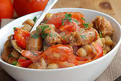 Pincho los chorizos y los llevo enteros a una olla con agua, y vino blanco. Aparte hago la salsa de tomate. Trituro unos tomates en lata. Un caldero con aceite al fuego. Le colocó ajo en láminas y luego el tomate., sal, hoja de laurel y luego mezclo con los garbanzos ya cocidos. Trozo los chorizos y los agrego. Acompaño con papas salteadas con porros y cebolla.