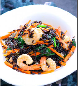En un wok o sartén grande, freír la cebolla con 4 cucharadas de aceite de oliva, agregar las zanahorias en juliana y rehogar un segundo. Agregue el arroz, mezclar bien y freír un minuto. Añadir los camarones y las espinacas y cocine durante 4-5 minutos, hasta que el arroz sea ligeramente crujiente. Servir el plato inmediatamente.